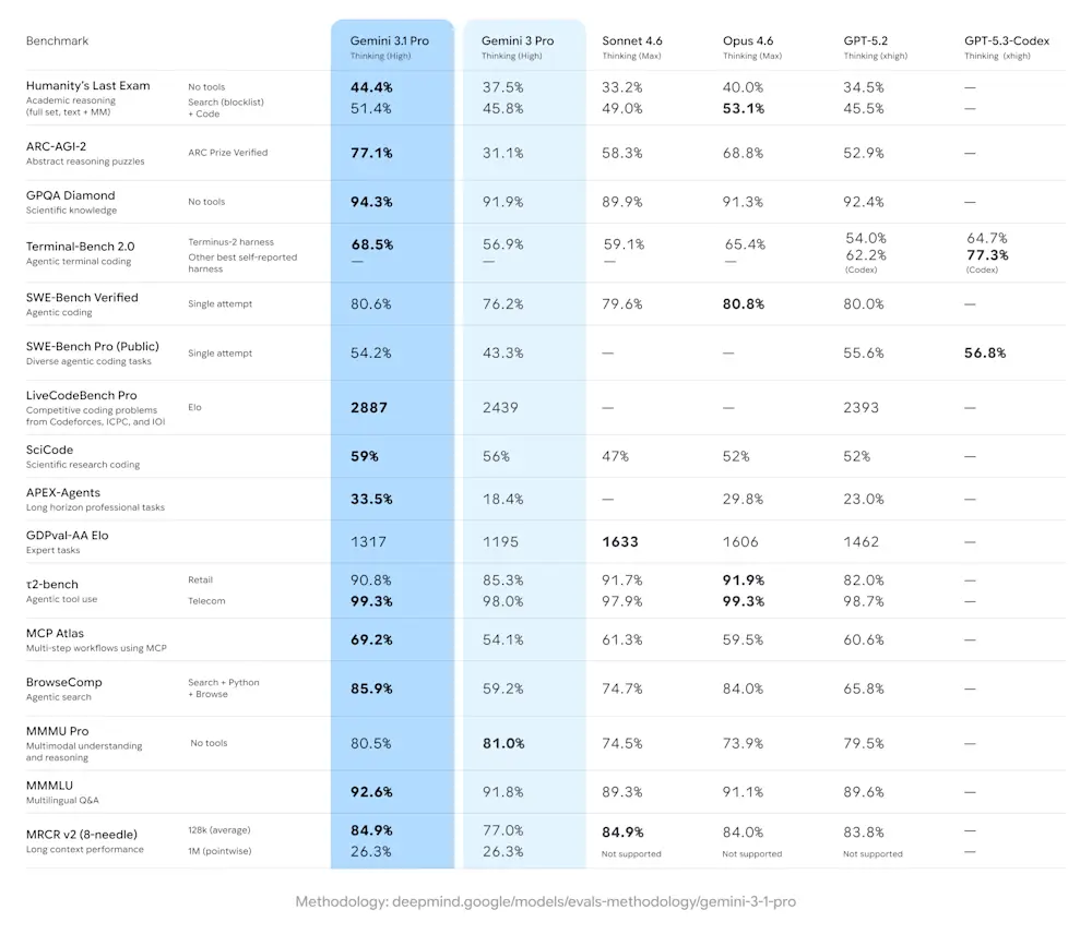 Google Gemini 3.1 Pro, akıl yürütmede %77.1, bilimsel bilgide %94.3, yazılım geliştirmede %80.6 ve multimodal anlamada %92.6 doğruluk elde ederek hem önceki Gemini sürümünü hem de birçok rakip modeli geride bıraktı.
