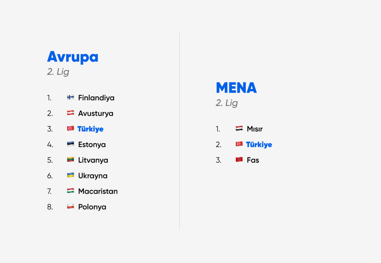 Türkiye, bu çeyrekte hem Avrupa hem de MENA sıralamasının 2. Lig kategorisinde konumlanıyor.